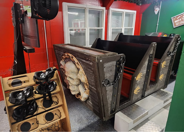 Details: Unique VR ride with 2 sleigh units. Can run together or separate. Take flight on a magical journey with this unique ride, an immersive virtual reality experience the whole family will love! Step into Santa’s sleigh, put on your VR headset, and soar through dazzling winter skies, twinkling cityscapes, and the enchanting North Pole. With several videos to choose from, it can be switched over for different times of the year. Feel the rush of wind as you glide past snow-covered rooftops, dodge playful reindeer, and deliver presents around the world! With lifelike motion, festive sights and sounds, and a dash of holiday magic, this interactive ride makes every guest feel like part of Santa’s team. ✨ Features: • Fully immersive VR experience with motion effects • Real sleigh-style seating • Two TVs for those who might not want to use the VR goggles • Family-friendly excitement for all ages • 12 VR sets and several “parts” sets • Charging stations and docks for headsets • 2 Control Pedestals • 2 Christmas Videos and 1 Halloween Video (license good through May 2026) • Small footprint – great for FECs or other locations looking for a smaller attraction with a great ROI • Changeable sides for the ride unit – Santa’s Sleigh and Spooky